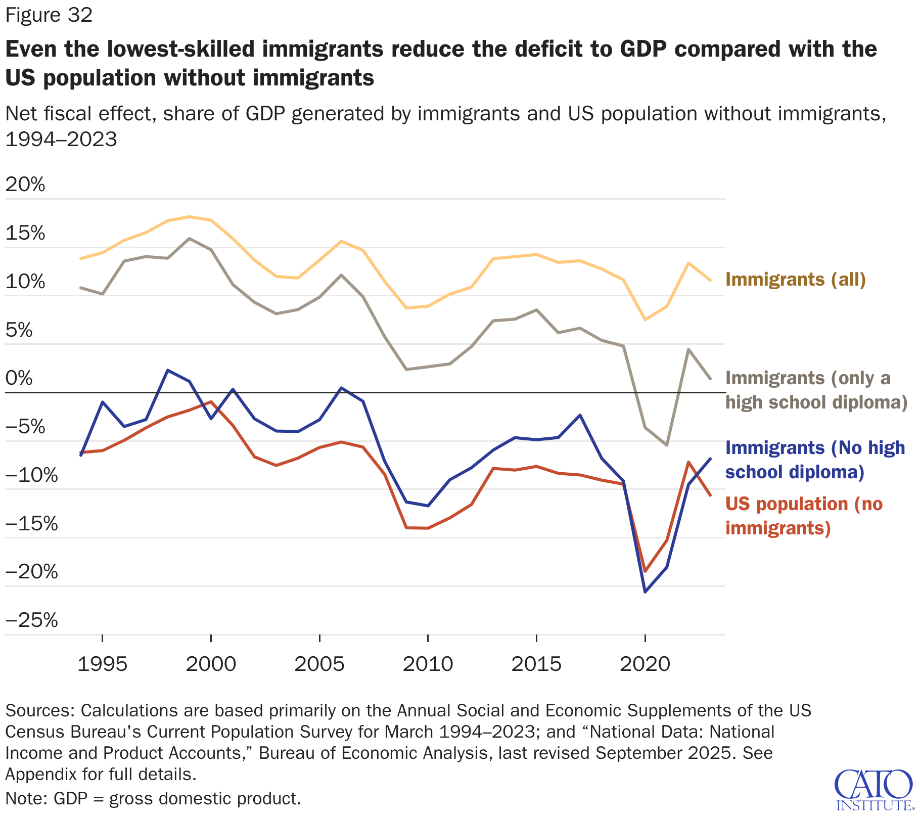 Net fiscal effect, share of GDP generated by immigrants and US population without immigrants, 1994–2023