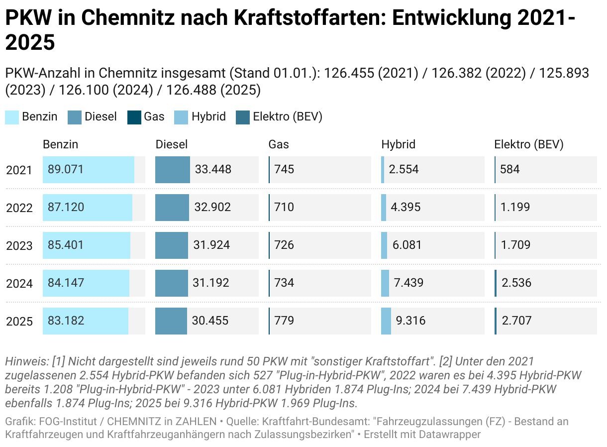 PKW-Anzahl in Chemnitz insgesamt (Stand 01.01.): 126.455 (2021) / 126.382 (2022) / 125.893 (2023) / 126.100 (2024) / 126.488 (2025)