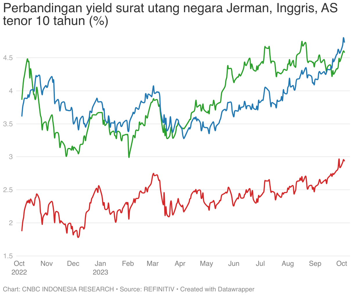 Perbandingan yield surat utang negara Jerman, Inggris, AS tenor 10 tahun (%)