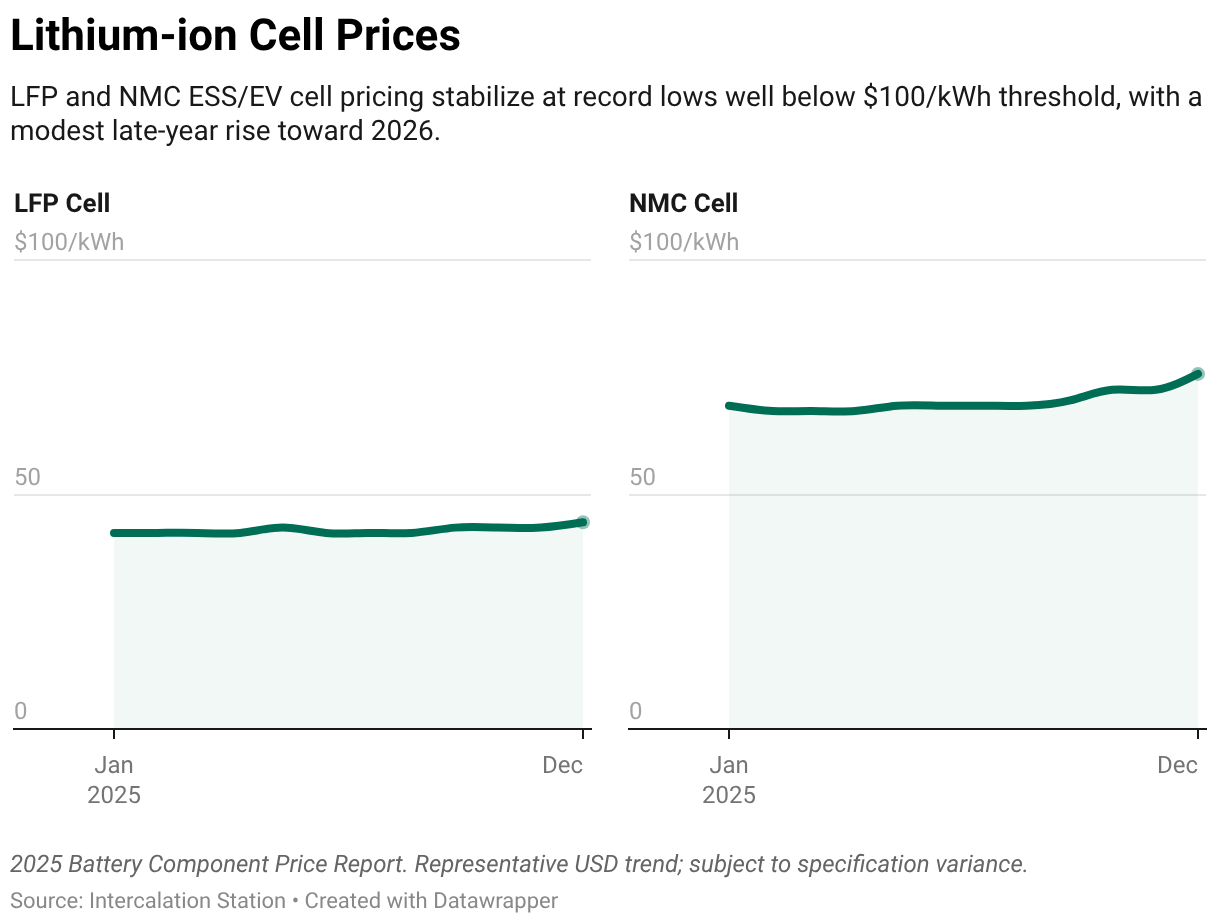 LFP and NMC ESS/EV cell pricing stabilize at record lows well below $100/kWh threshold, with a modest late-year rise toward 2026.