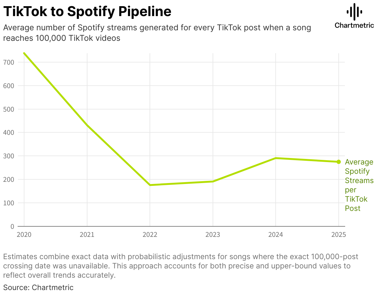 Average number of Spotify streams generated for every TikTok post when a song reaches 100,000 TikTok videos