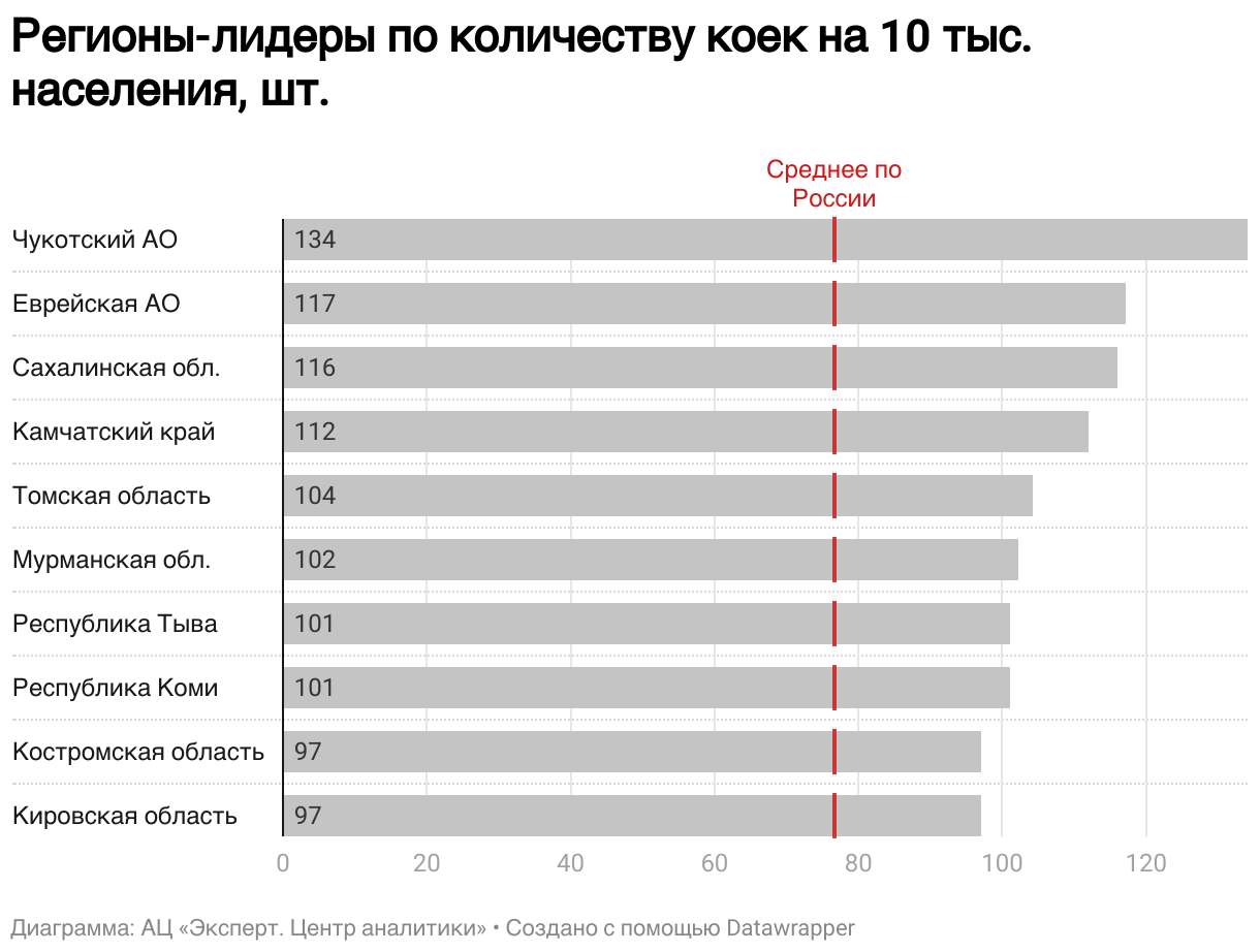 Регионы-лидеры по количеству коек на 10 тыс. населения, шт.