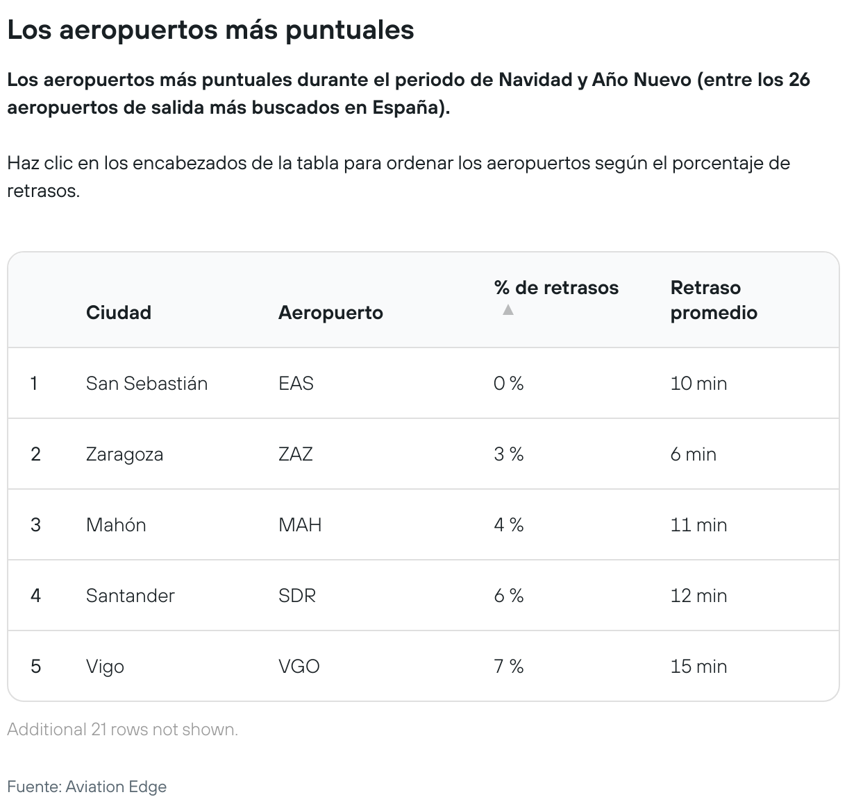 Los aeropuertos más puntuales durante el periodo de Navidad y Año Nuevo (entre los 26 aeropuertos de salida más buscados en España). Haz clic en los encabezados de la tabla para ordenar los aeropuertos según el porcentaje de retrasos.