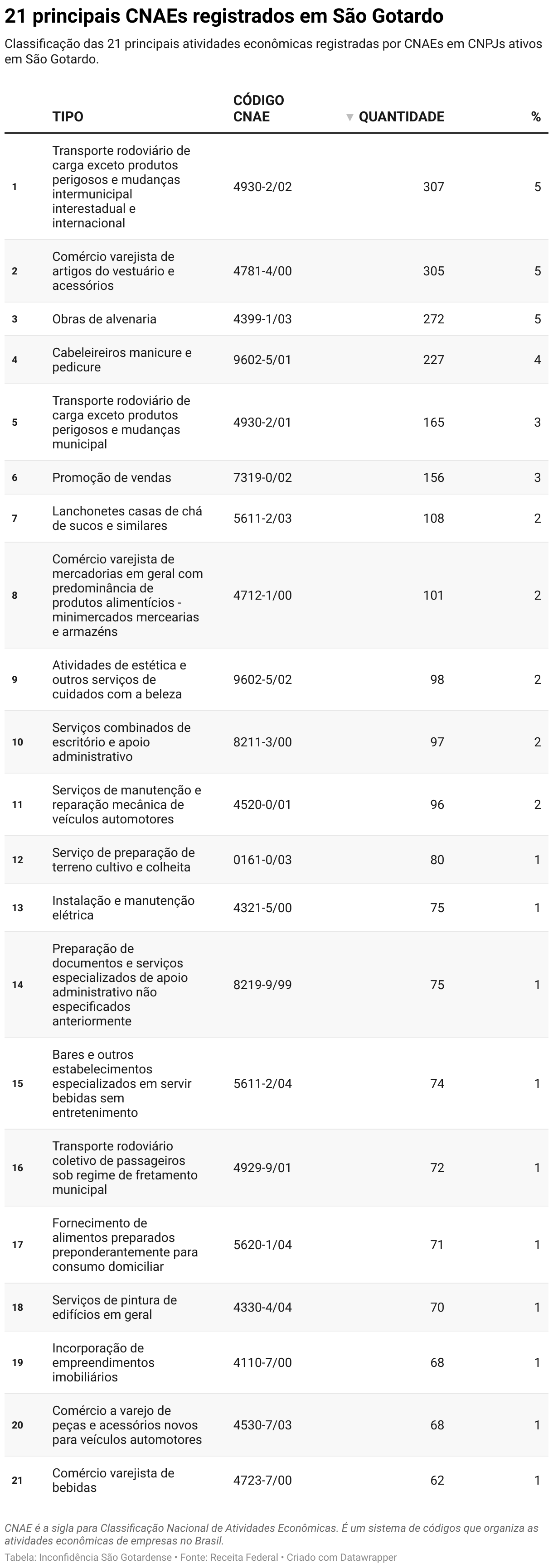 Classificação das 21 principais atividades econômicas registradas por CNAEs em CNPJs ativos em São Gotardo.
