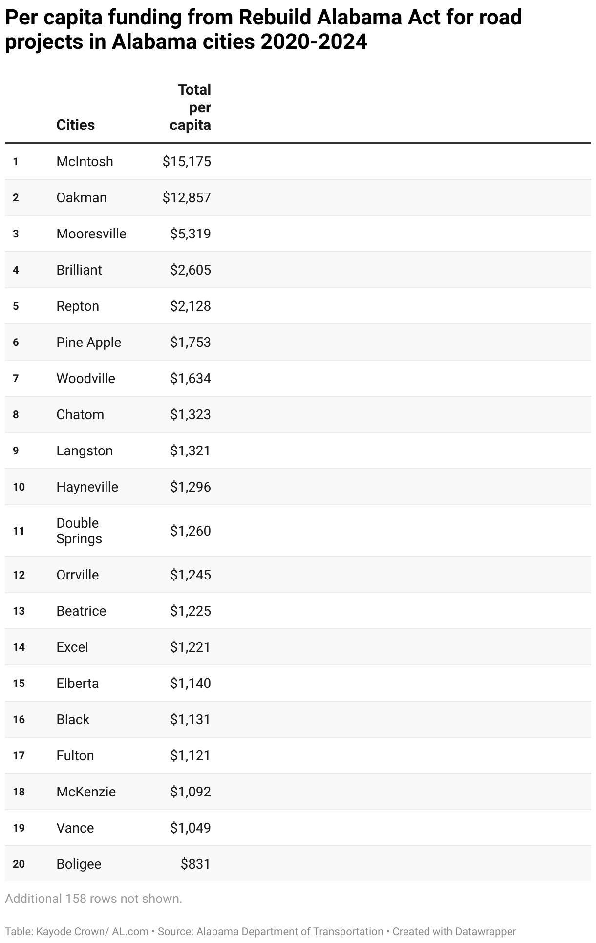 Per capita funding from Rebuild Alabama Act for road projects in Alabama cities 2020-2024