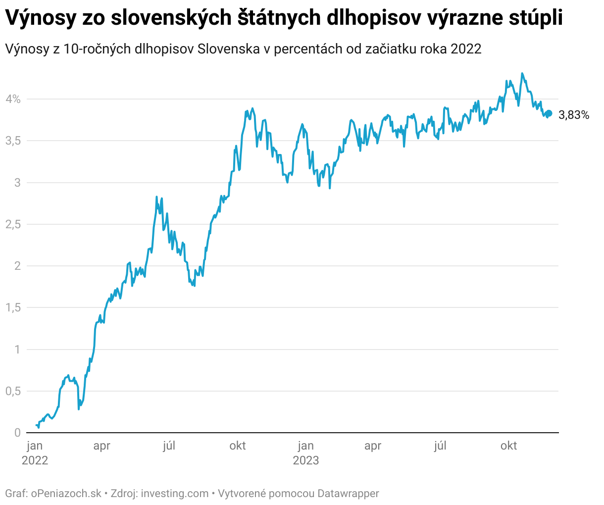 Výnosy z 10-ročných dlhopisov Slovenska v percentách od začiatku roka 2022
