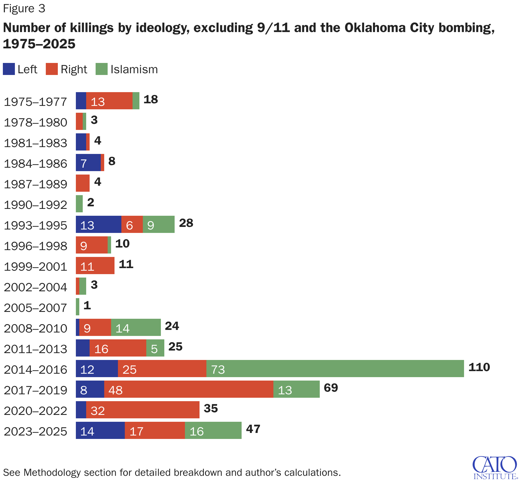 Number of killings by ideology, excluding 9/11 and the Oklahoma City bombing, 1975–2025
