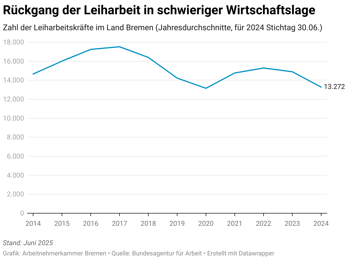 Zahl der Leiharbeitskräfte im Land Bremen (Jahresdurchschnitte, für 2024 Stichtag 30.06.)