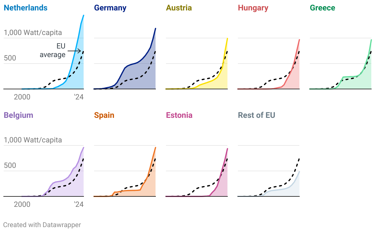 Relative installed solar power capacity in the EU, in Watt per capita