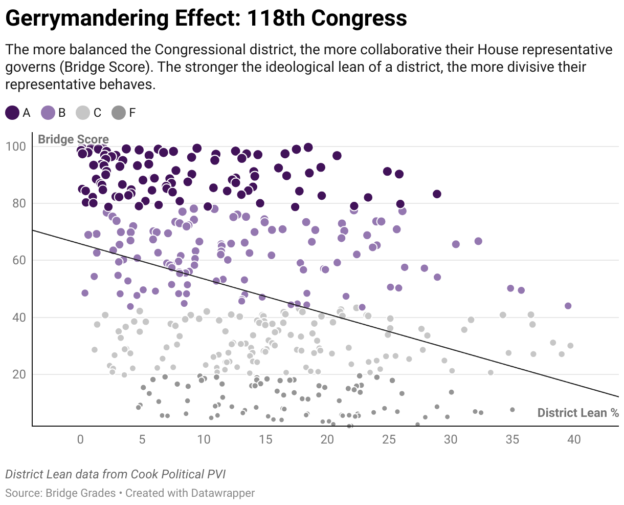 The more balanced the Congressional district, the more collaborative their House representative governs (Bridge Score). The stronger the ideological lean of a district, the more divisive their representative behaves.