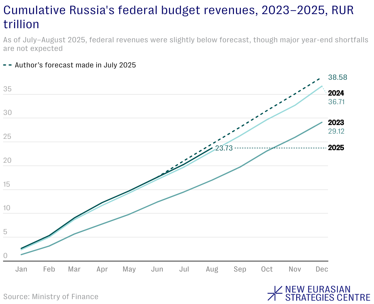 As of July–August 2025, federal revenues were slightly below forecast, though major year-end shortfalls are not expected