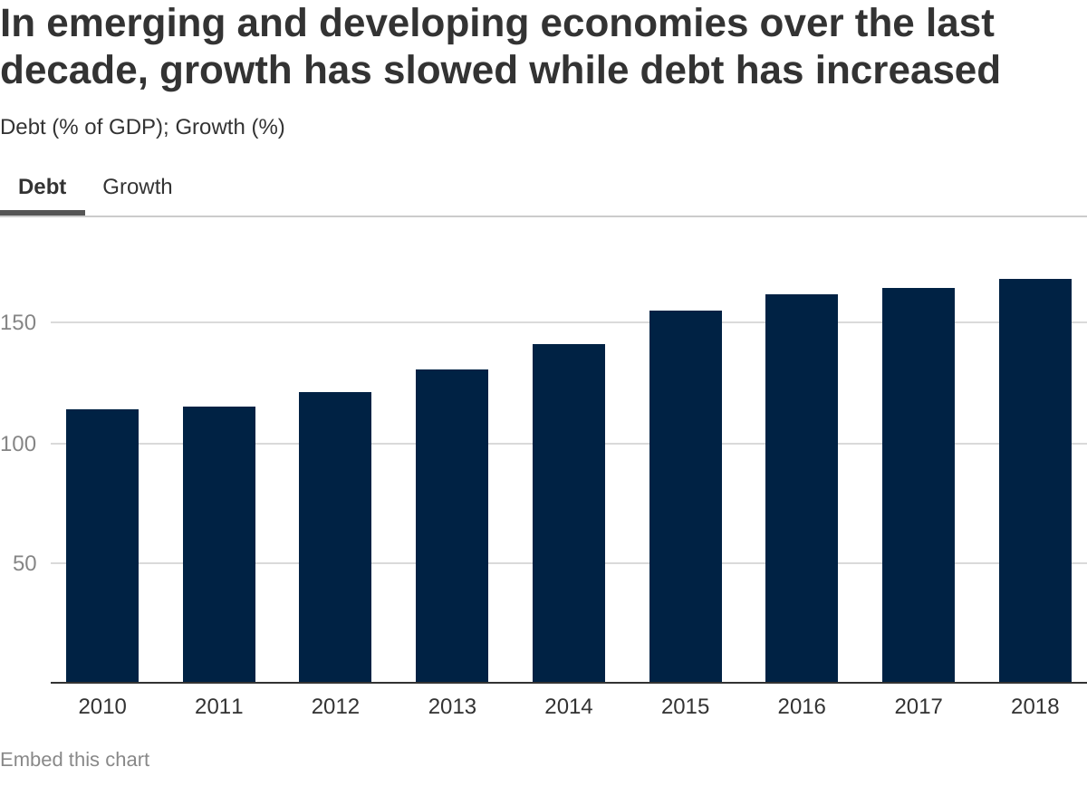 In emerging and developing economies over the last decade, growth has slowed while debt has increased