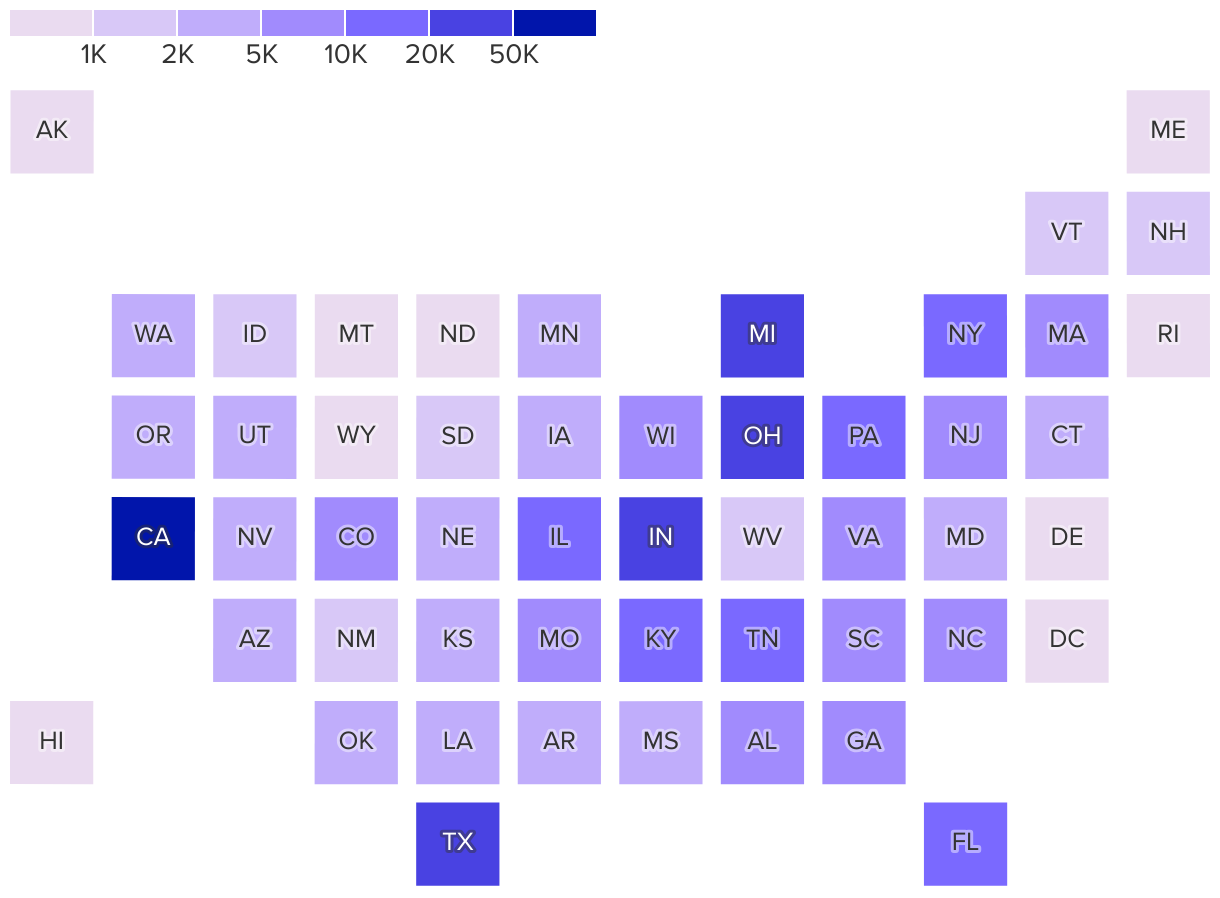 The tile map of the U.S. shows states ranked by the number of clean vehicle jobs they have.