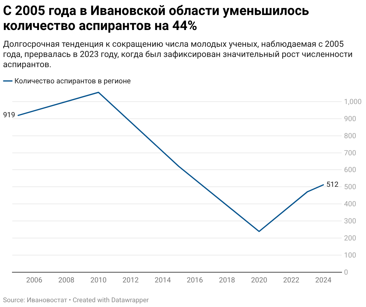 Долгосрочная тенденция к сокращению числа молодых ученых, наблюдаемая с 2005 года, прервалась в 2023 году, когда был зафиксирован значительный рост численности аспирантов.