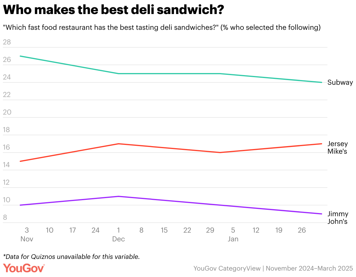 "Which fast food restaurant has the best tasting deli sandwiches?" (% who selected the following)