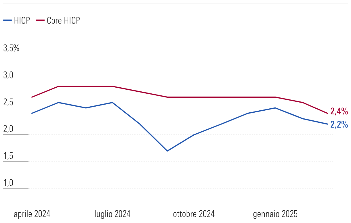 Grafico lineare che mostra l'inflazione nell'eurozona da Aprile 2024 a Aprile 2025.