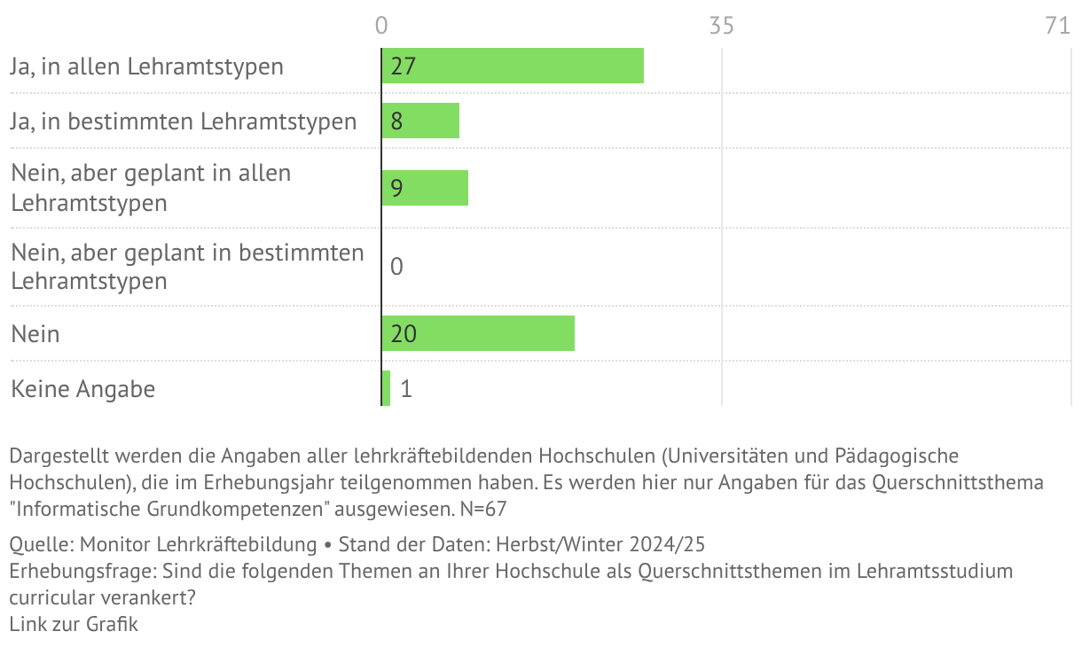 Dargestellt werden die Angaben aller lehrkräftebildenden Hochschulen (Universitäten und Pädagogische Hochschulen), die im Erhebungsjahr teilgenommen haben. Es werden hier nur Angaben für das Querschnittsthema "Informatische Grundkompetenzen" ausgewiesen. N=67