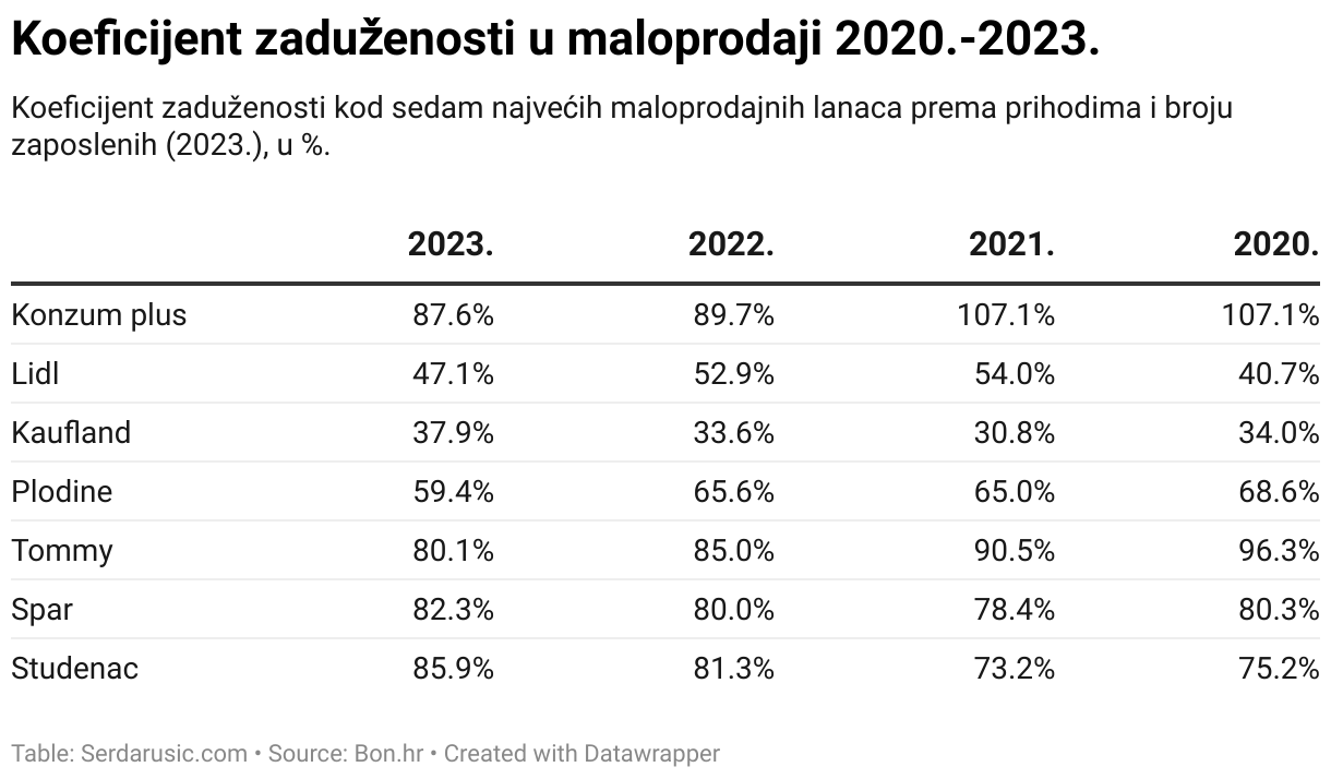 Koeficijent zaduženosti kod sedam najvećih maloprodajnih lanaca prema prihodima i broju zaposlenih (2023.), u %.