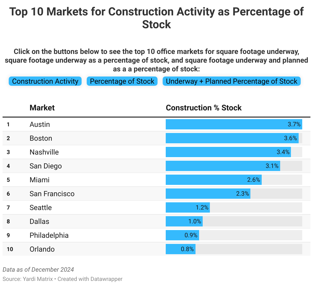 Click on the buttons below to see the top 10 office markets for square footage underway, square footage underway as a percentage of stock, and square footage underway and planned as a a percentage of stock: