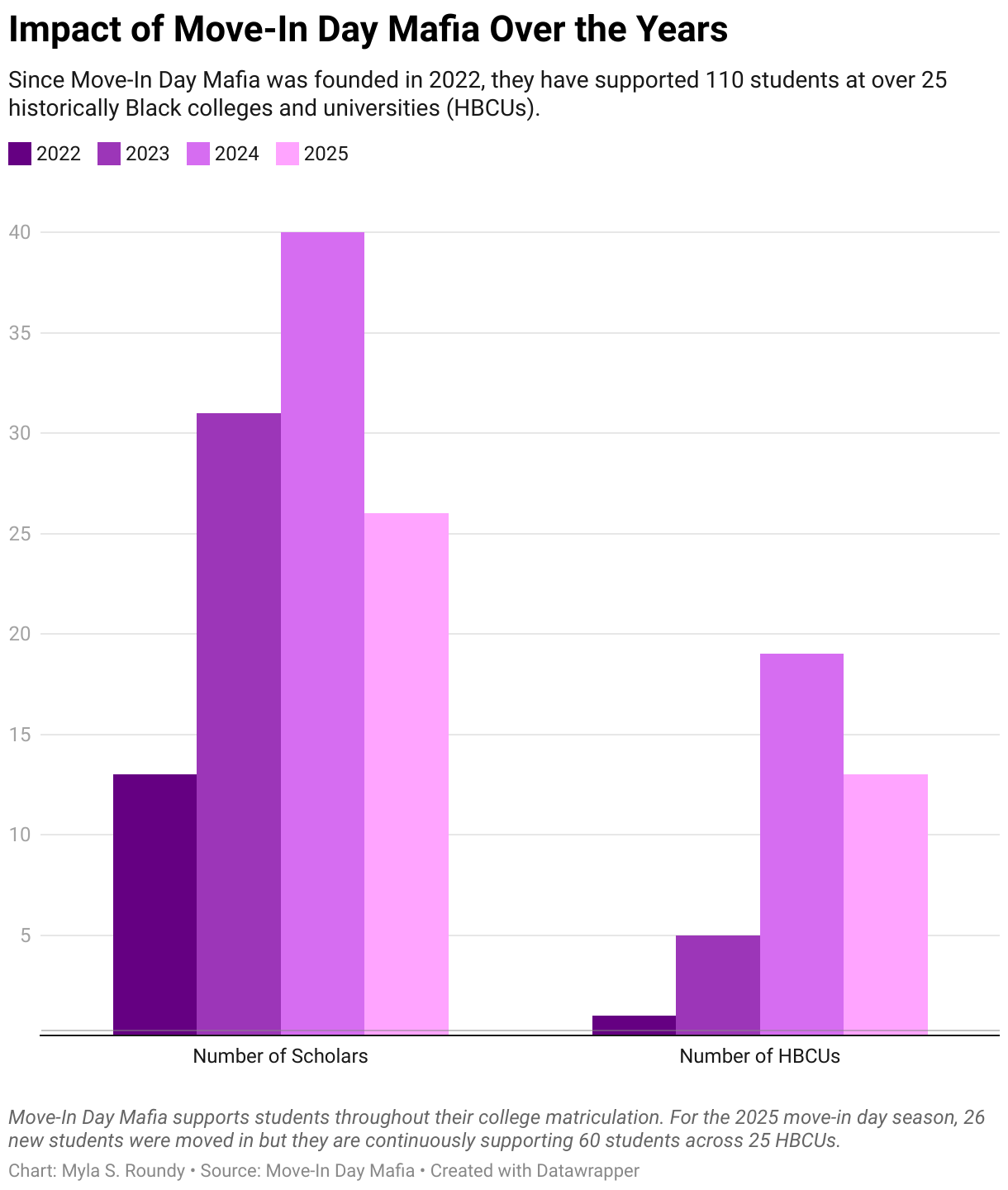 Since Move-In Day Mafia was founded in 2022, they have supported 110 students at over 25 historically Black colleges and universities (HBCUs).