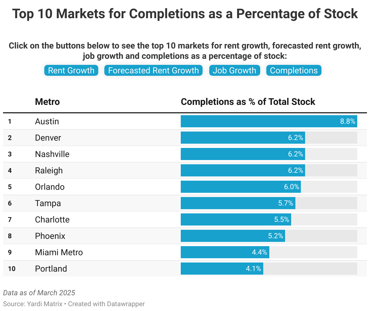 Click on the buttons below to see the top 10 markets for rent growth, forecasted rent growth, job growth and completions as a percentage of stock: