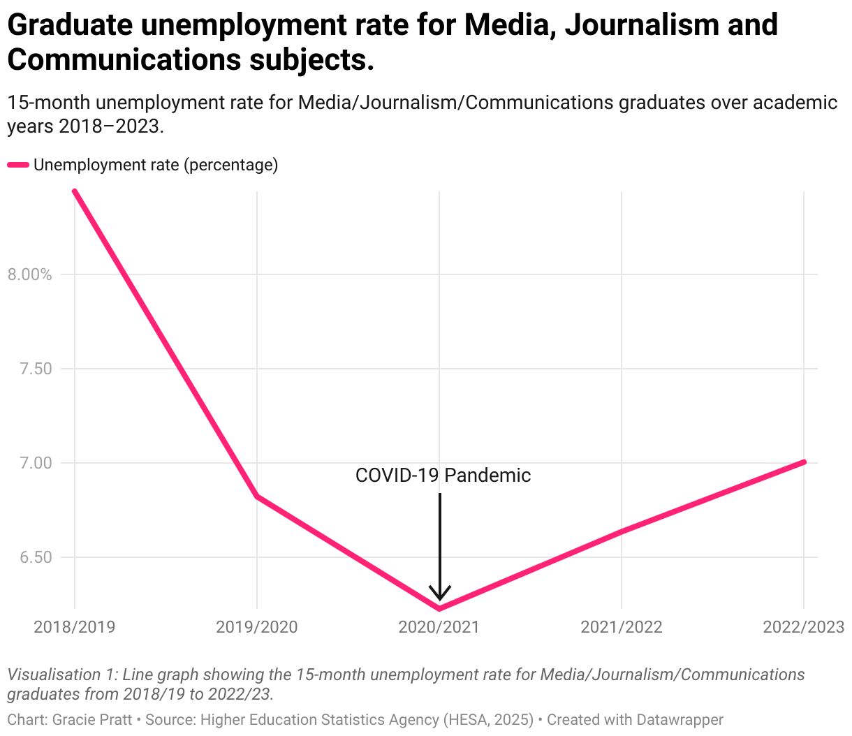 15-month unemployment rate for Media/Journalism/Communications graduates over academic years 2018–2023.