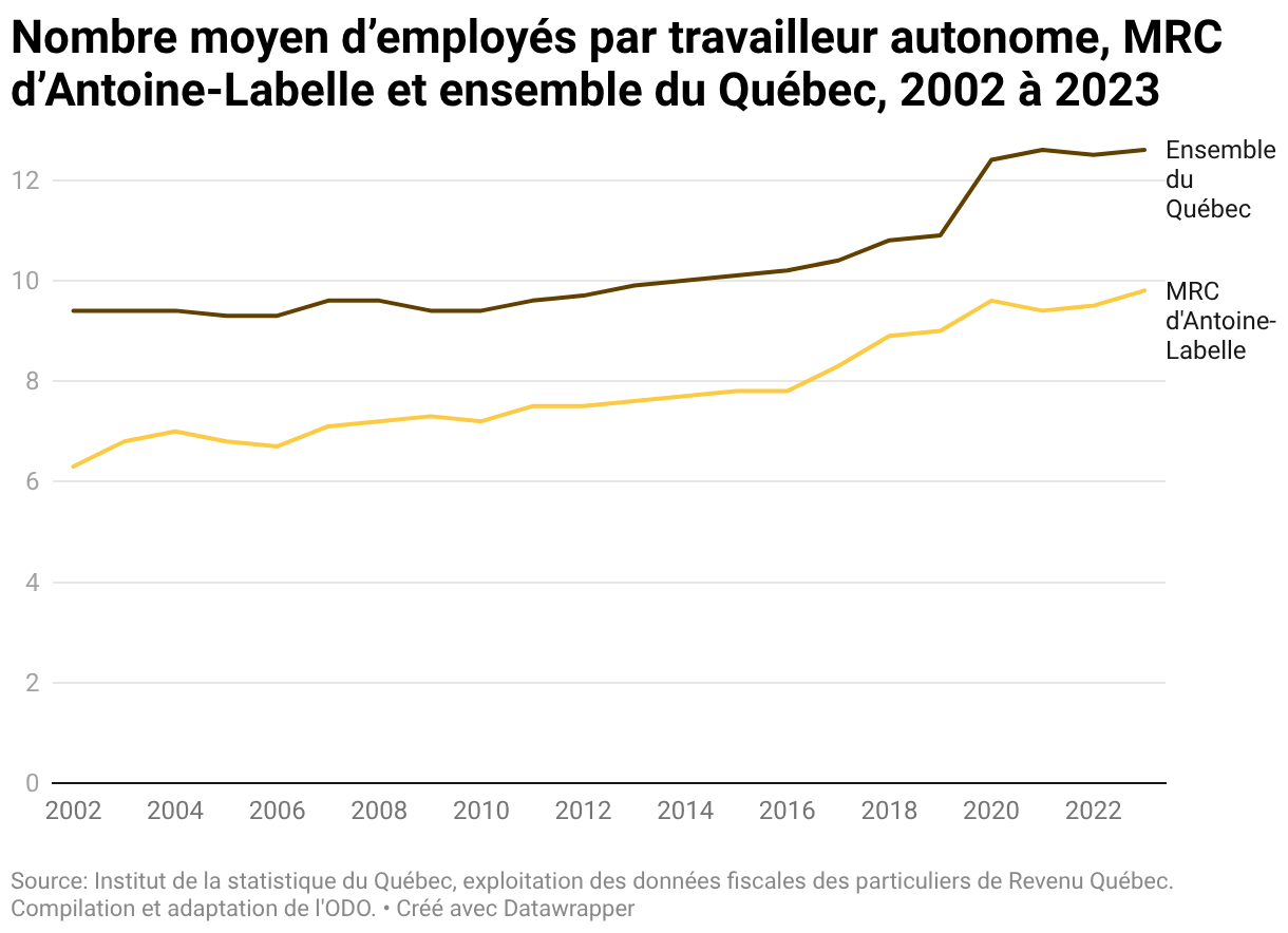 Nombre moyen d’employés par travailleur autonome, MRC d’Antoine-Labelle et ensemble du Québec, 2002 à 2023