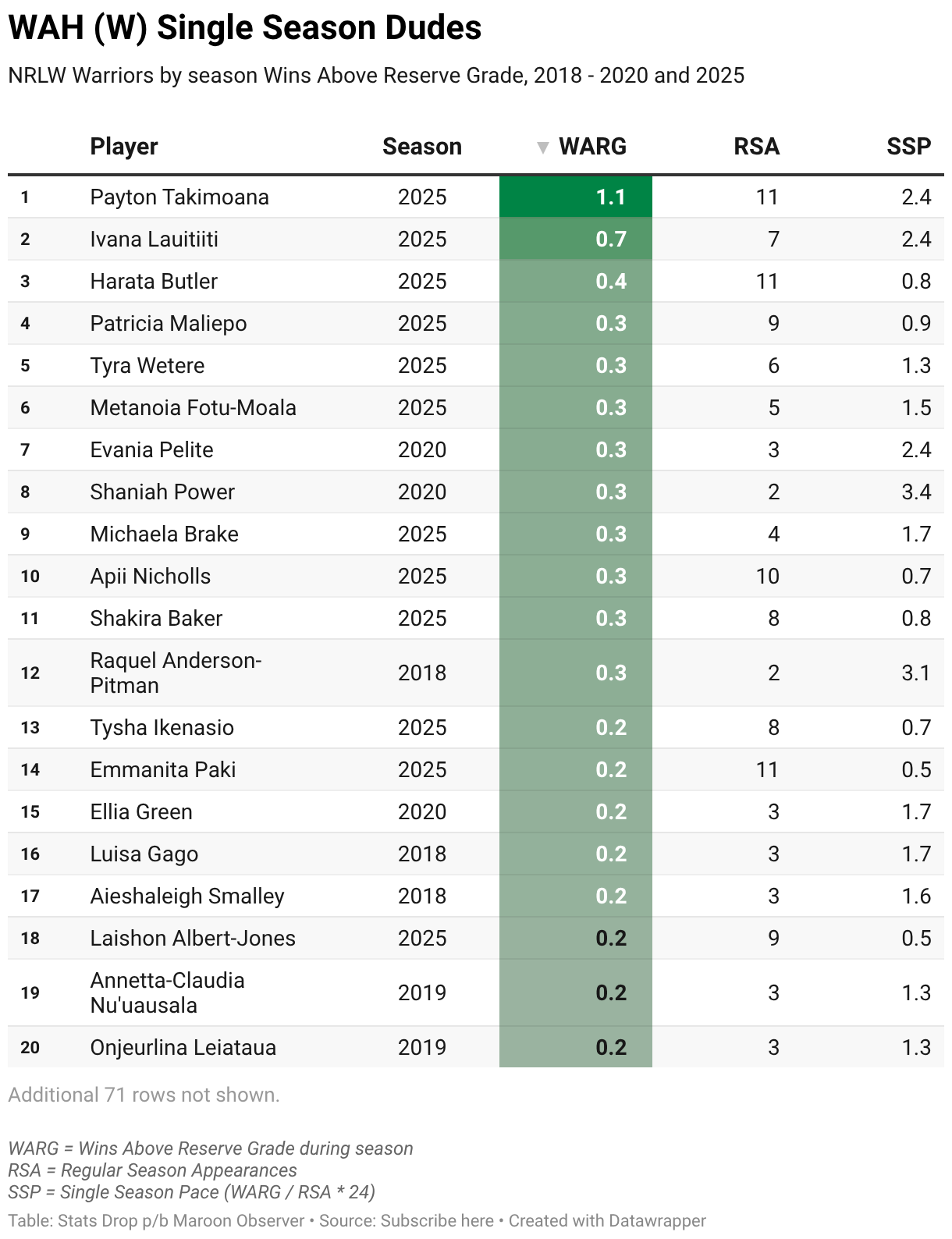 NRLW Warriors by season Wins Above Reserve Grade, 2018 - 2020 and 2025