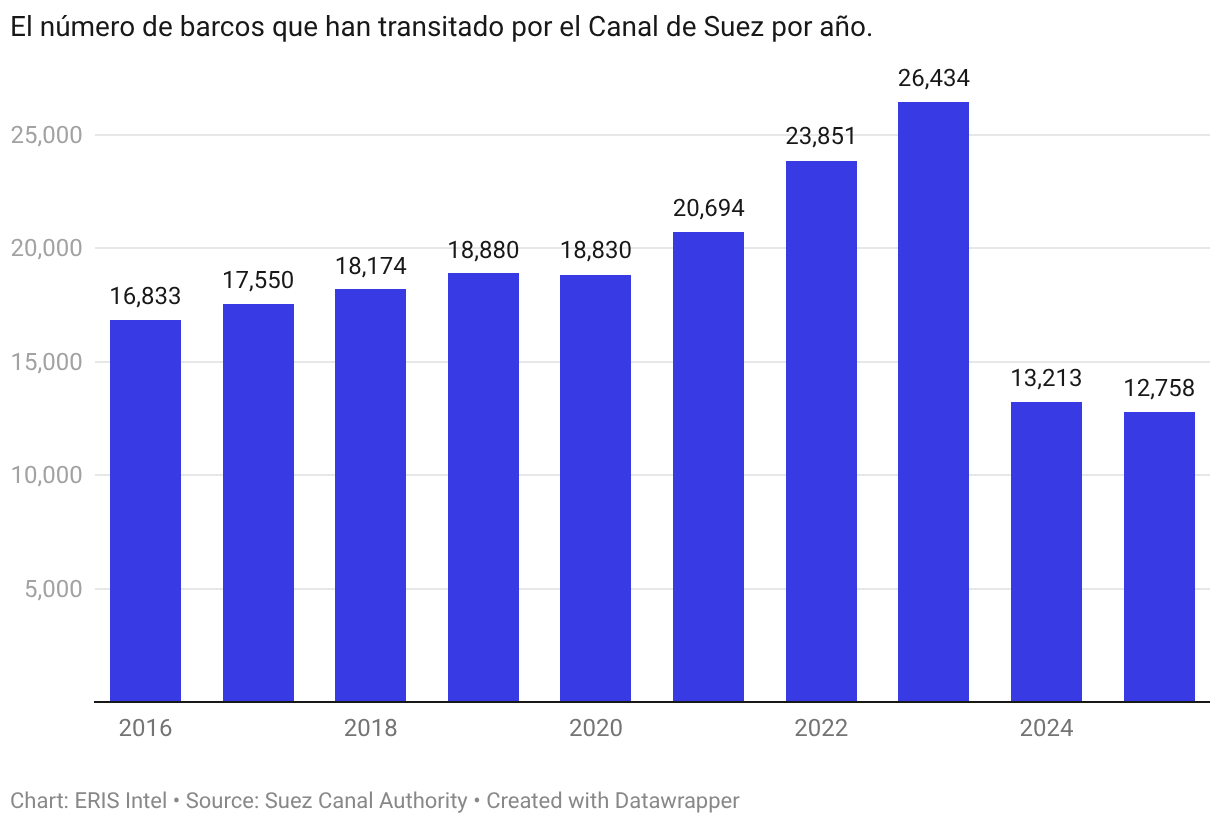 El número de barcos que han transitado por el Canal de Suez por año.