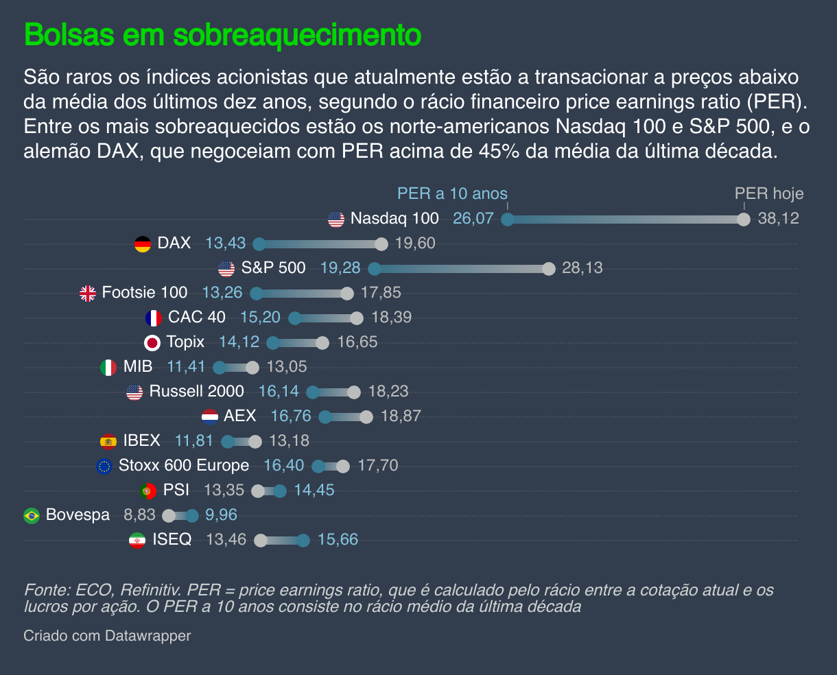 São raros os índices acionistas que atualmente estão a transacionar a preços abaixo da média dos últimos dez anos, segundo o rácio financeiro price earnings ratio (PER). Entre os mais sobreaquecidos estão os norte-americanos Nasdaq 100 e S&P 500, e o alemão DAX, que negoceiam com PER acima de 45% da média da última década.