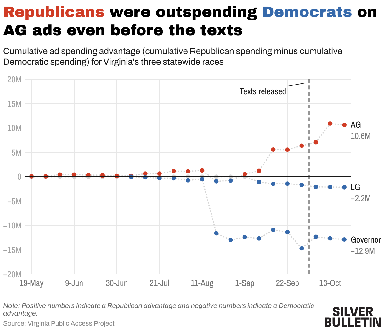 Cumulative ad spending advantage (cumulative Republican spending minus cumulative Democratic spending) for Virginia's three statewide races