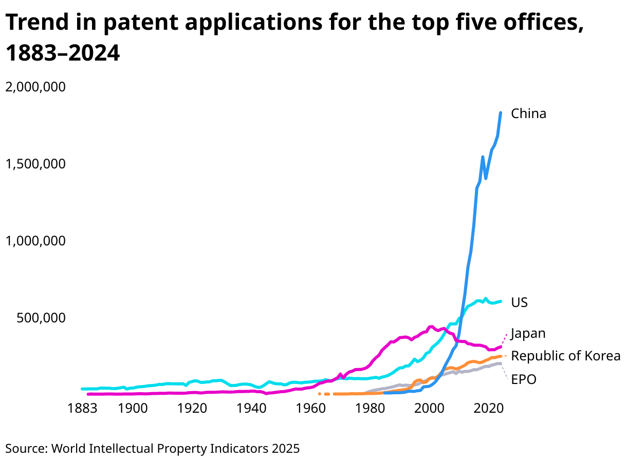 Trend in patent applications for the top five offices, 1883–2024
