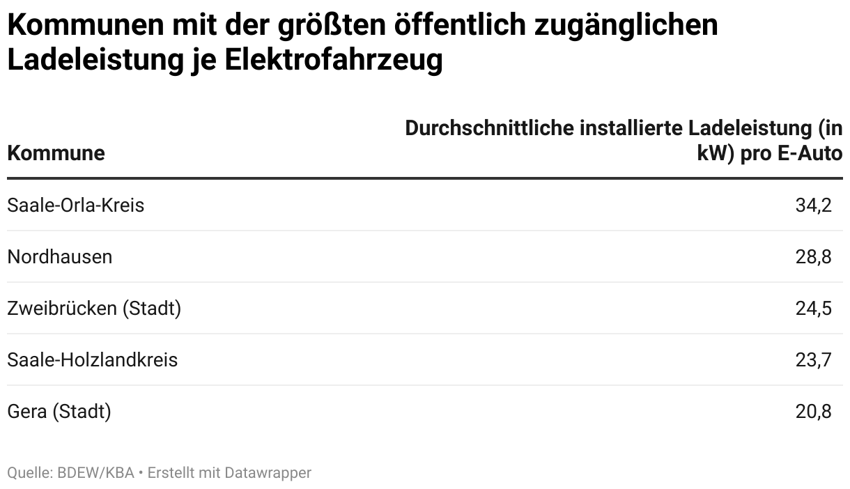 Kommunen mit der größten öffentlich zugänglichen Ladeleistung je Elektrofahrzeug