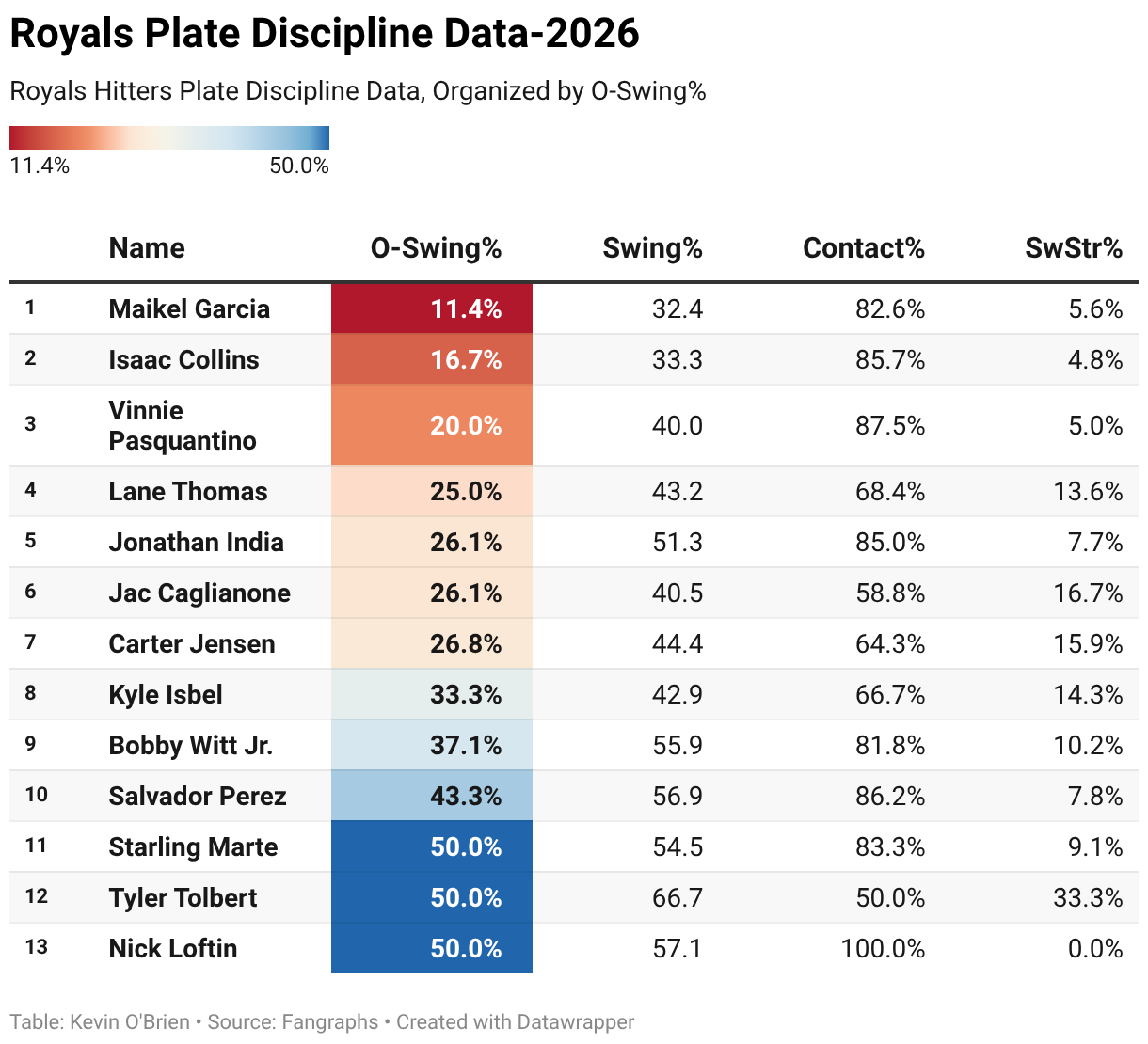 Royals Hitters Plate Discipline Data, Organized by O-Swing%