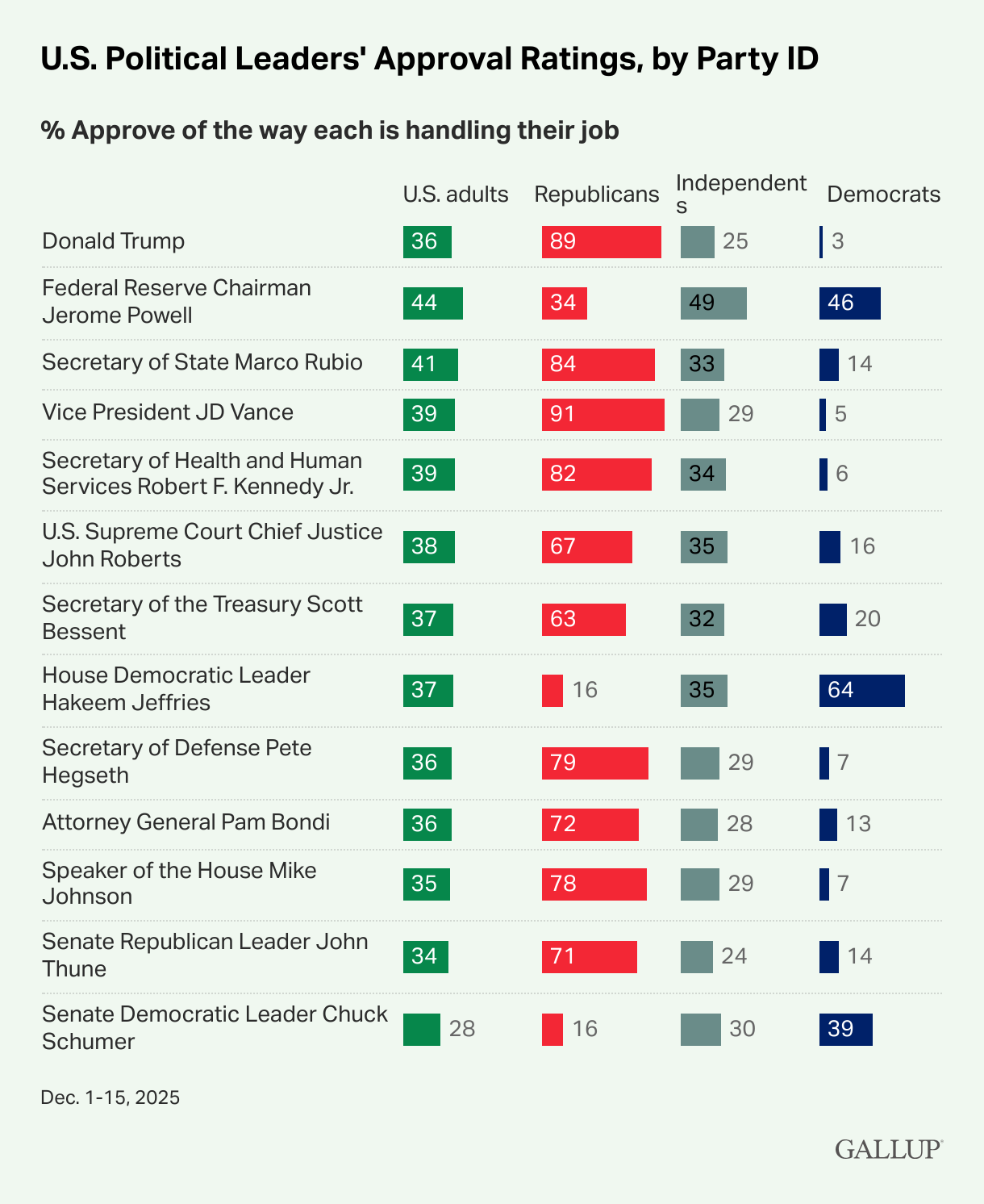 Bar chart showing U.S. adults' approval of political leaders in December 2025, by party ID. Donald Trump (89%) and JD Vance (91%) have the highest Republican support; Hakeem Jeffries (64%) and Chuck Schumer (39%) lead among Democrats. Overall approval is highest for Jerome Powell (44%).