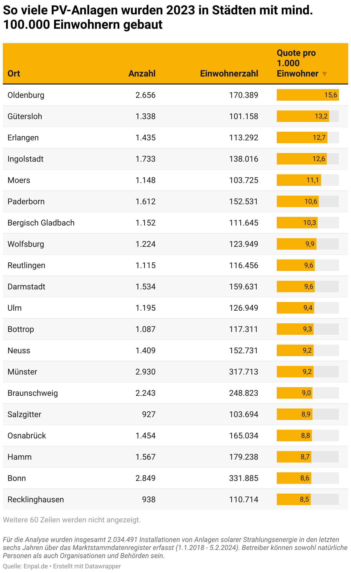 So viele PV-Anlagen wurden 2023 in Städten mit mind. 100.000 Einwohnern gebaut