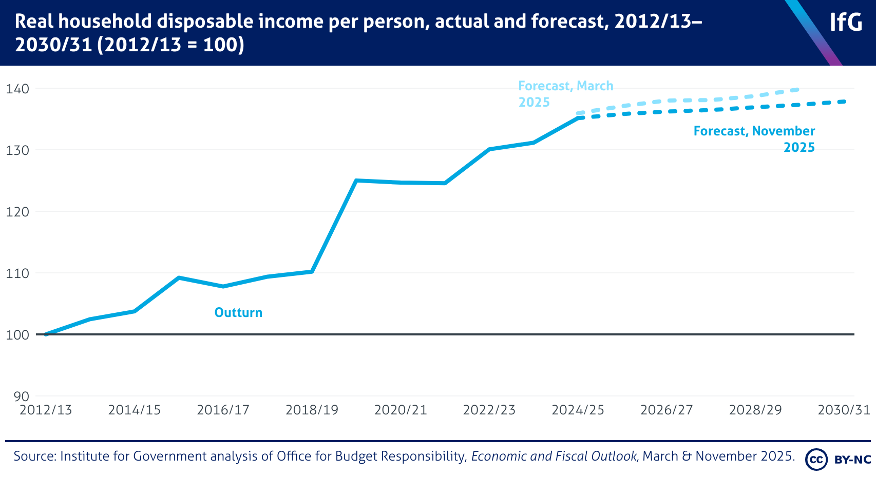 Real household disposable income per person, actual and forecast, 2012/13–2030/31 (2012/13 = 100)