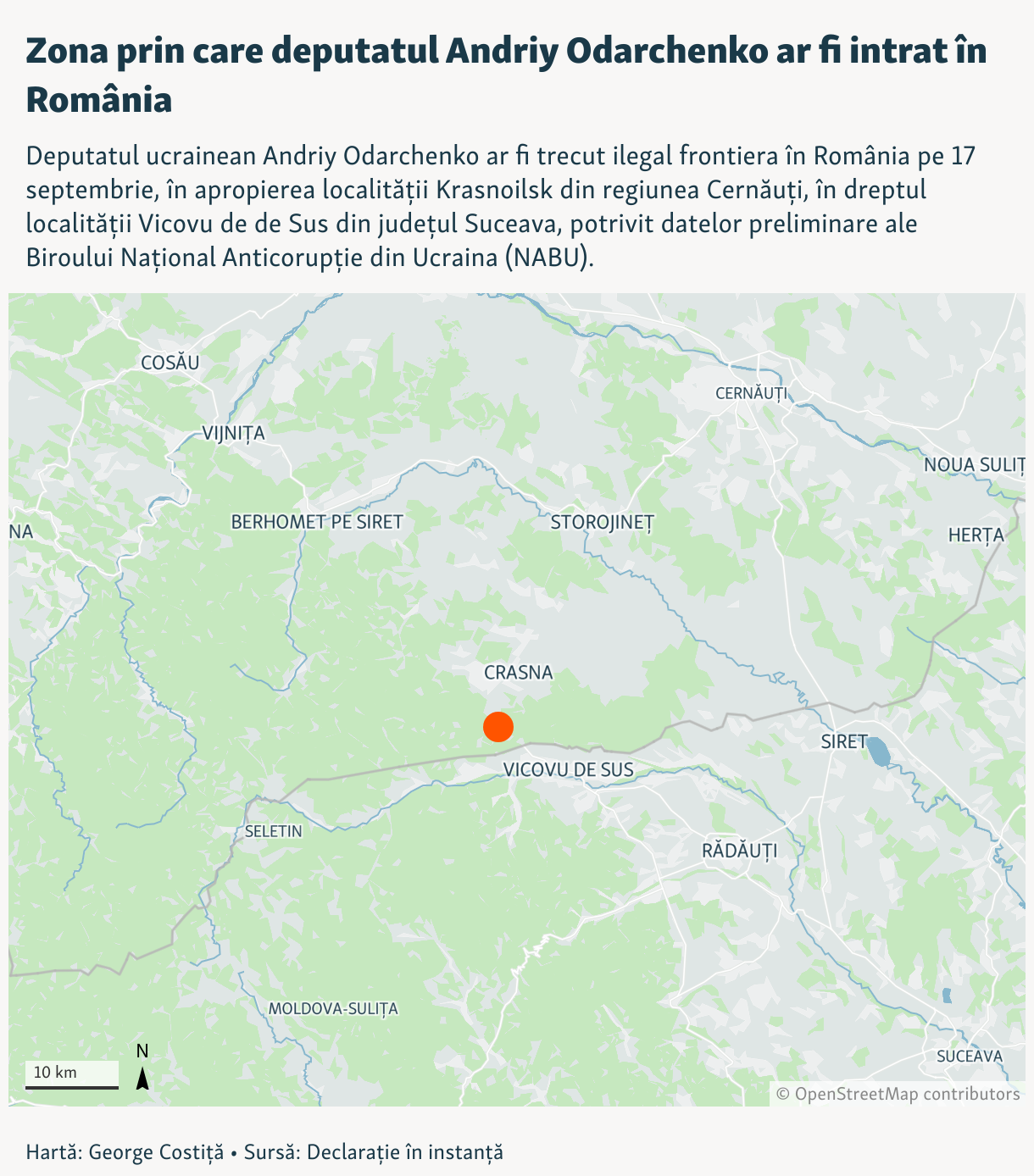 Deputatul ucrainean Andriy Odarchenko ar fi trecut ilegal frontiera în România pe 17 septembrie, în apropierea localității Krasnoilsk din regiunea Cernăuți, în dreptul localității Vicovu de de Sus din județul Suceava, potrivit datelor preliminare ale Biroului Național Anticorupție din Ucraina (NABU).