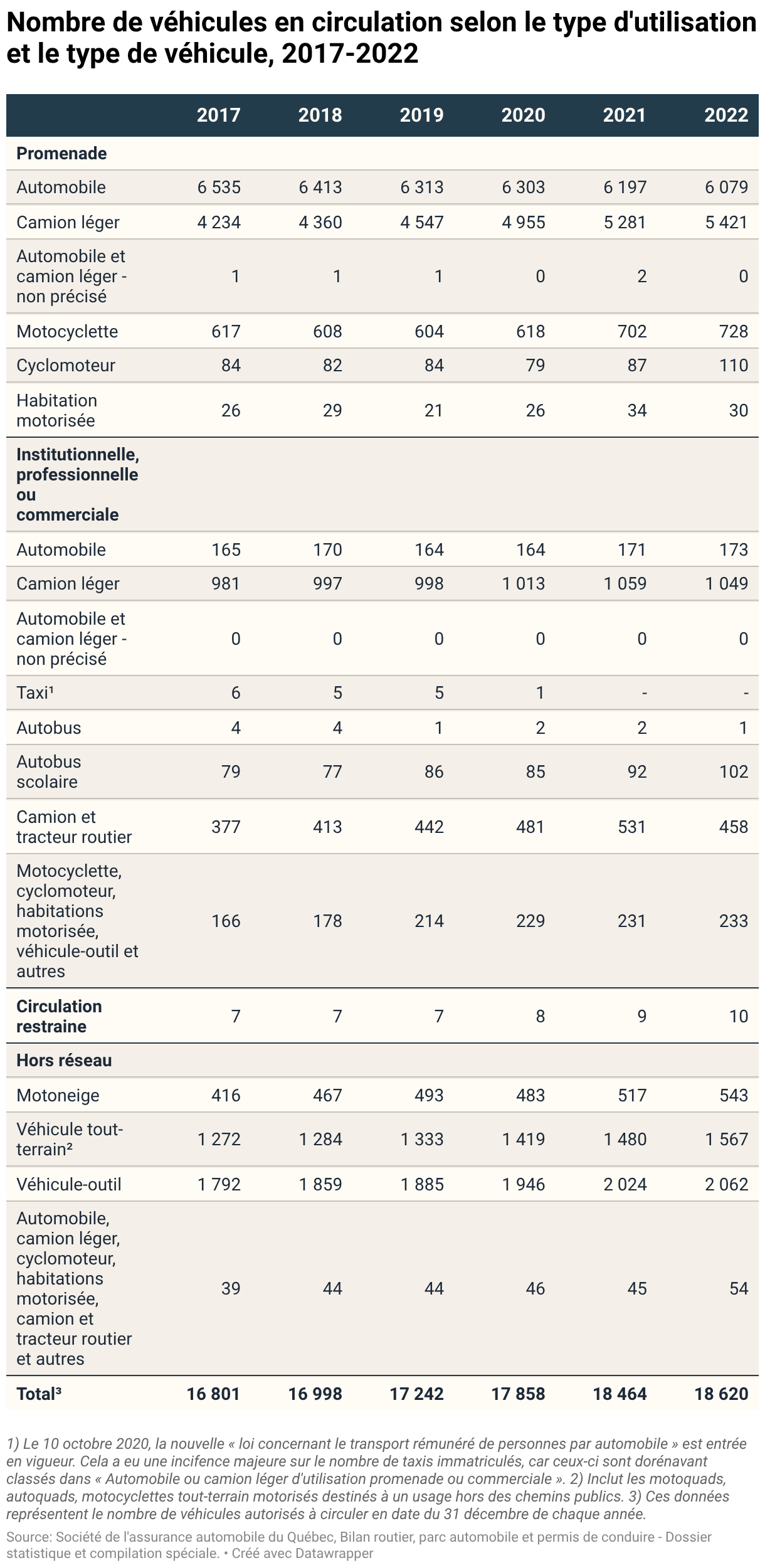Nombre de véhicules en circulation selon le type d'utilisation et le type de véhicule, 2017-2022