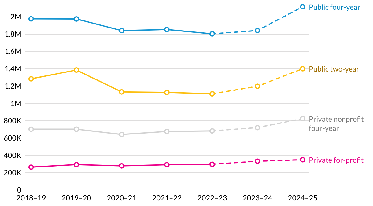 ALTTEXT: A line chart showing the total number of Pell recipients in the first quarter of the financial aid year, from 2018-19 to 2024-25. Data are shown for public four year, public two year, private non-profit four year, and private for-profit institutions.