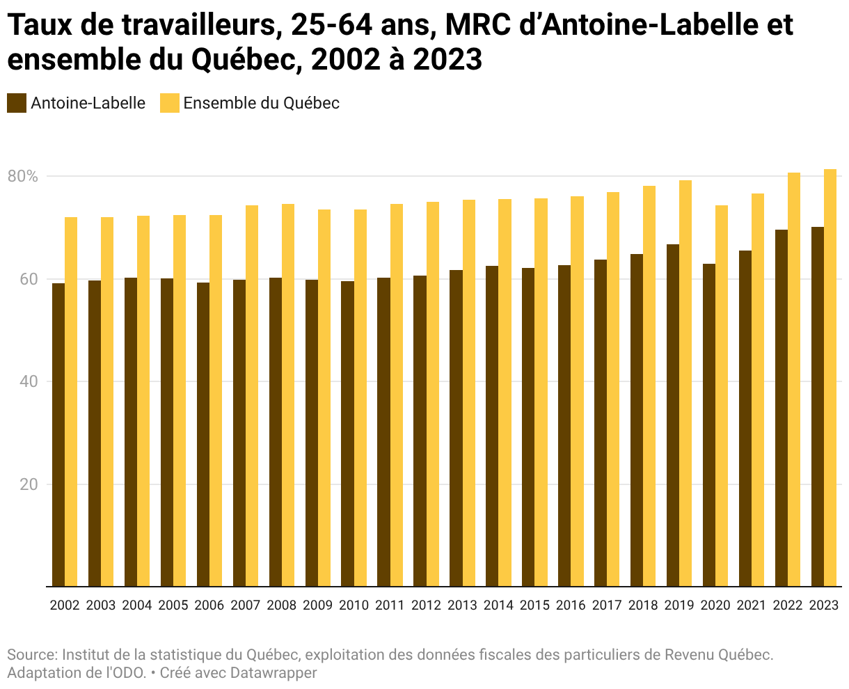 Taux de travailleurs, 25-64 ans, MRC d’Antoine-Labelle et ensemble du Québec, 2002 à 2023