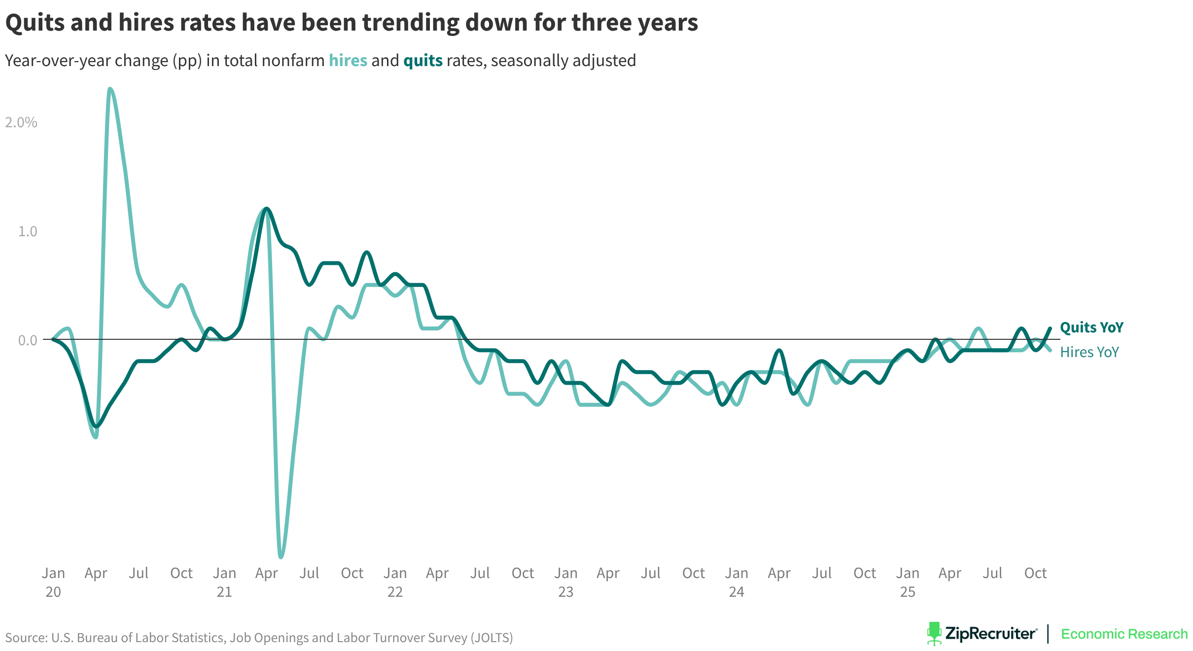 Year-over-year change (pp) in total nonfarm hires and quits rates, seasonally adjusted