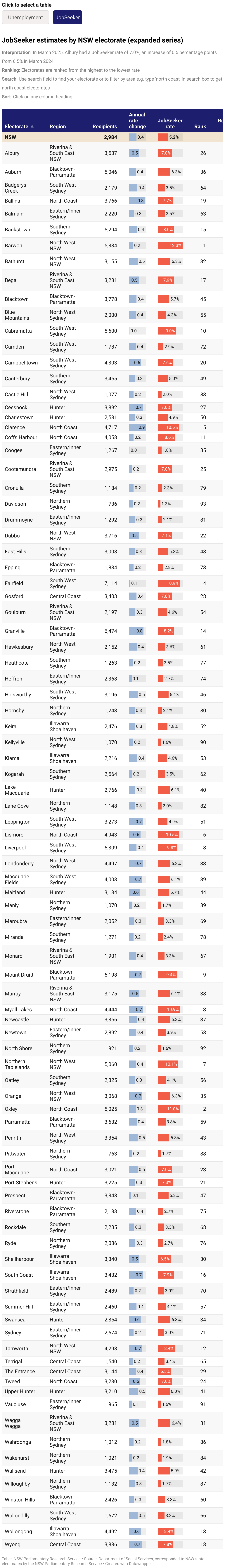 Interpretation: In March 2025, Albury had a JobSeeker rate of 7.0%, an increase of 0.5 percentage points from 6.5% in March 2024