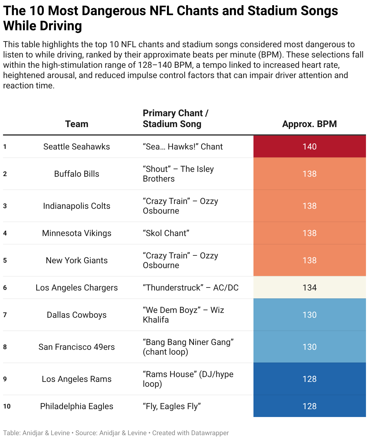 This table highlights the top 10 NFL chants and stadium songs considered most dangerous to listen to while driving, ranked by their approximate beats per minute (BPM). These selections fall within the high-stimulation range of 128–140 BPM, a tempo linked to increased heart rate, heightened arousal, and reduced impulse control factors that can impair driver attention and reaction time.