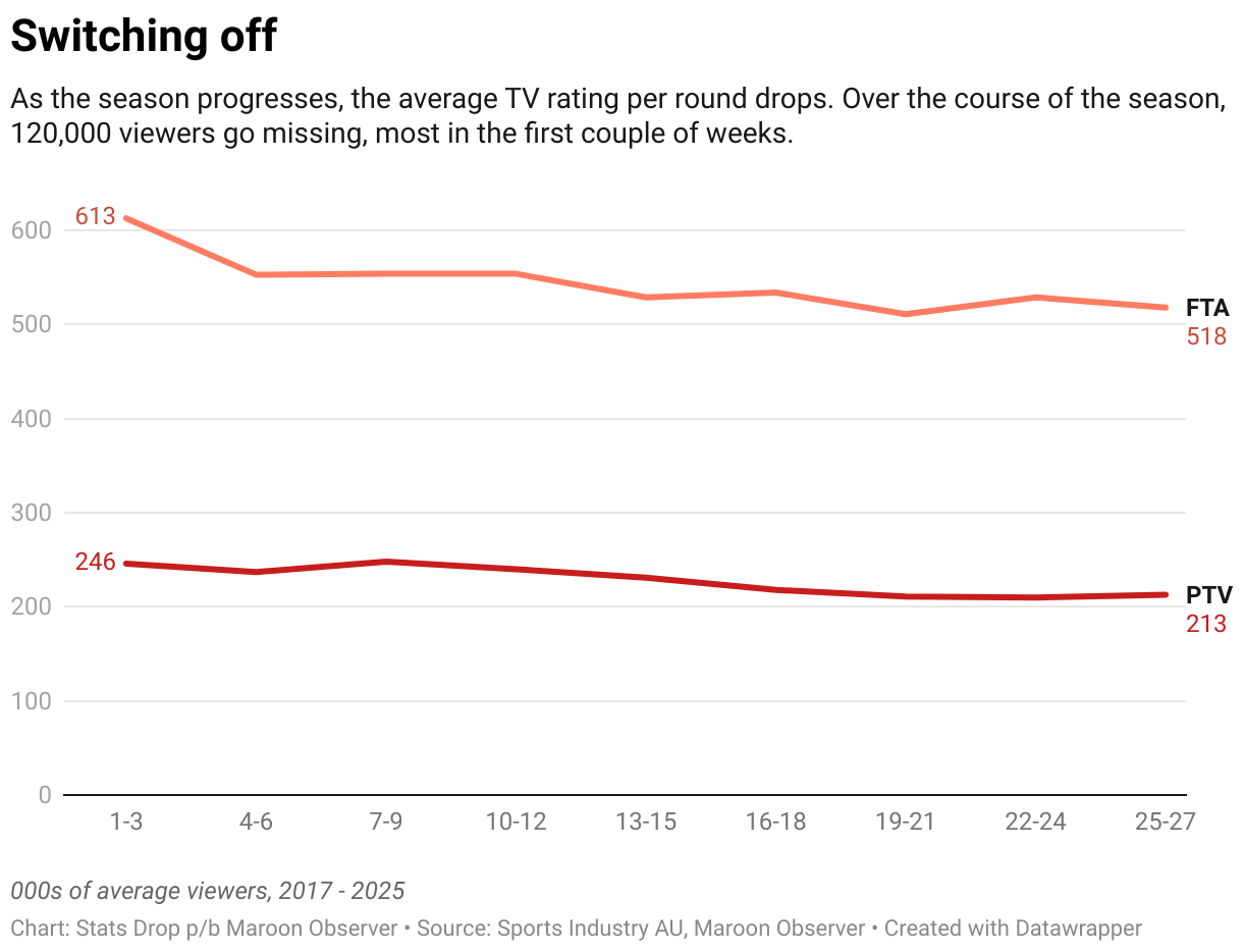 As the season progresses, the average TV rating per round drops. Over the course of the season, 120,000 viewers go missing, most in the first couple of weeks.