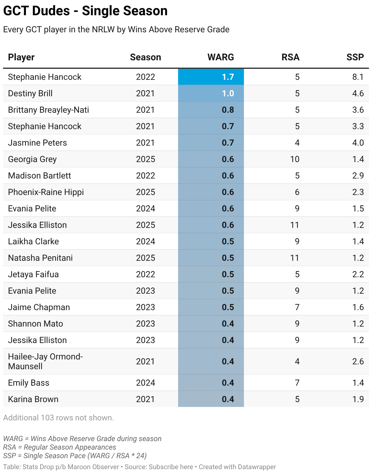Every GCT player in the NRLW by Wins Above Reserve Grade