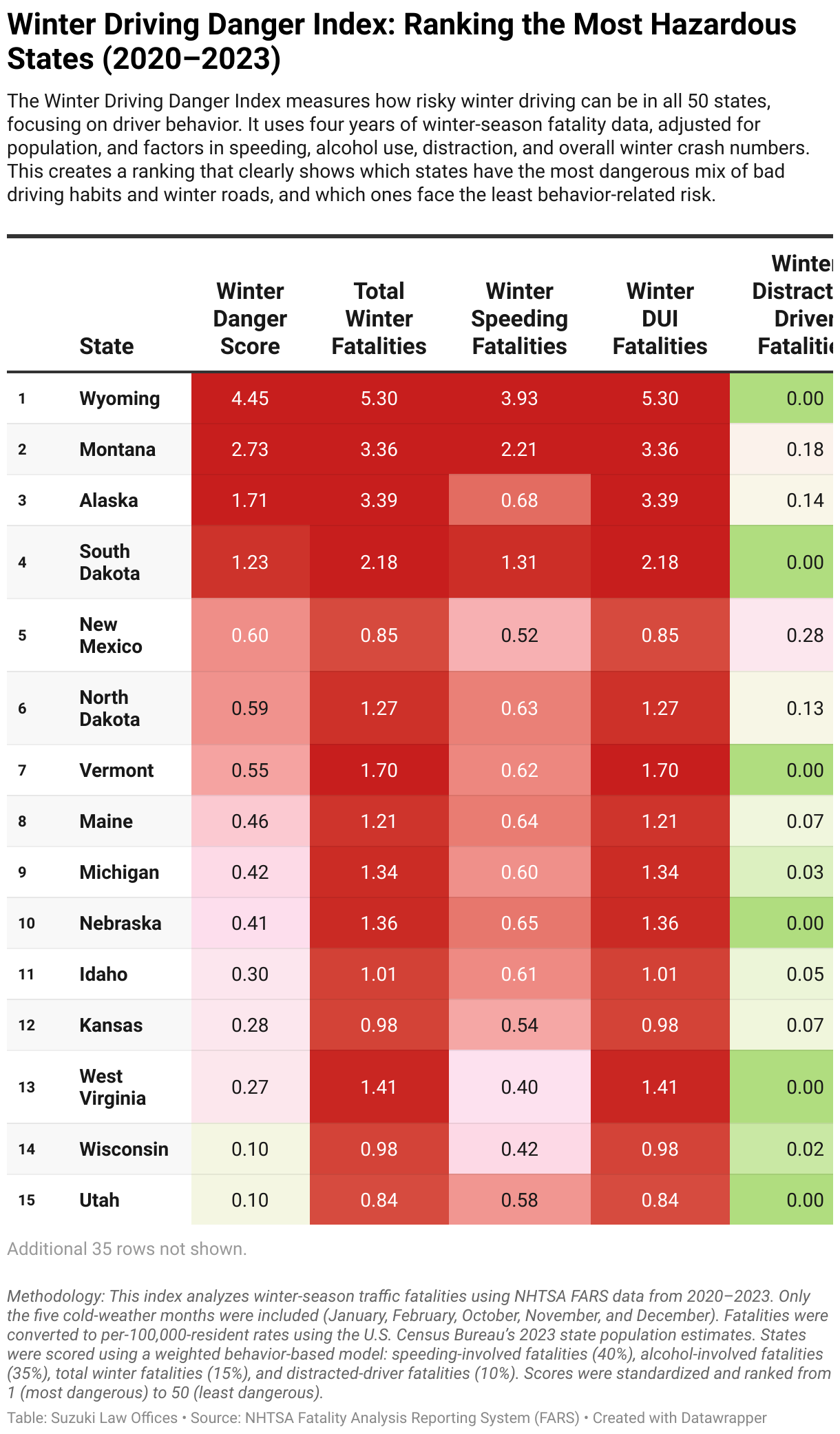 The Winter Driving Danger Index measures how risky winter driving can be in all 50 states, focusing on driver behavior. It uses four years of winter-season fatality data, adjusted for population, and factors in speeding, alcohol use, distraction, and overall winter crash numbers. This creates a ranking that clearly shows which states have the most dangerous mix of bad driving habits and winter roads, and which ones face the least behavior-related risk.