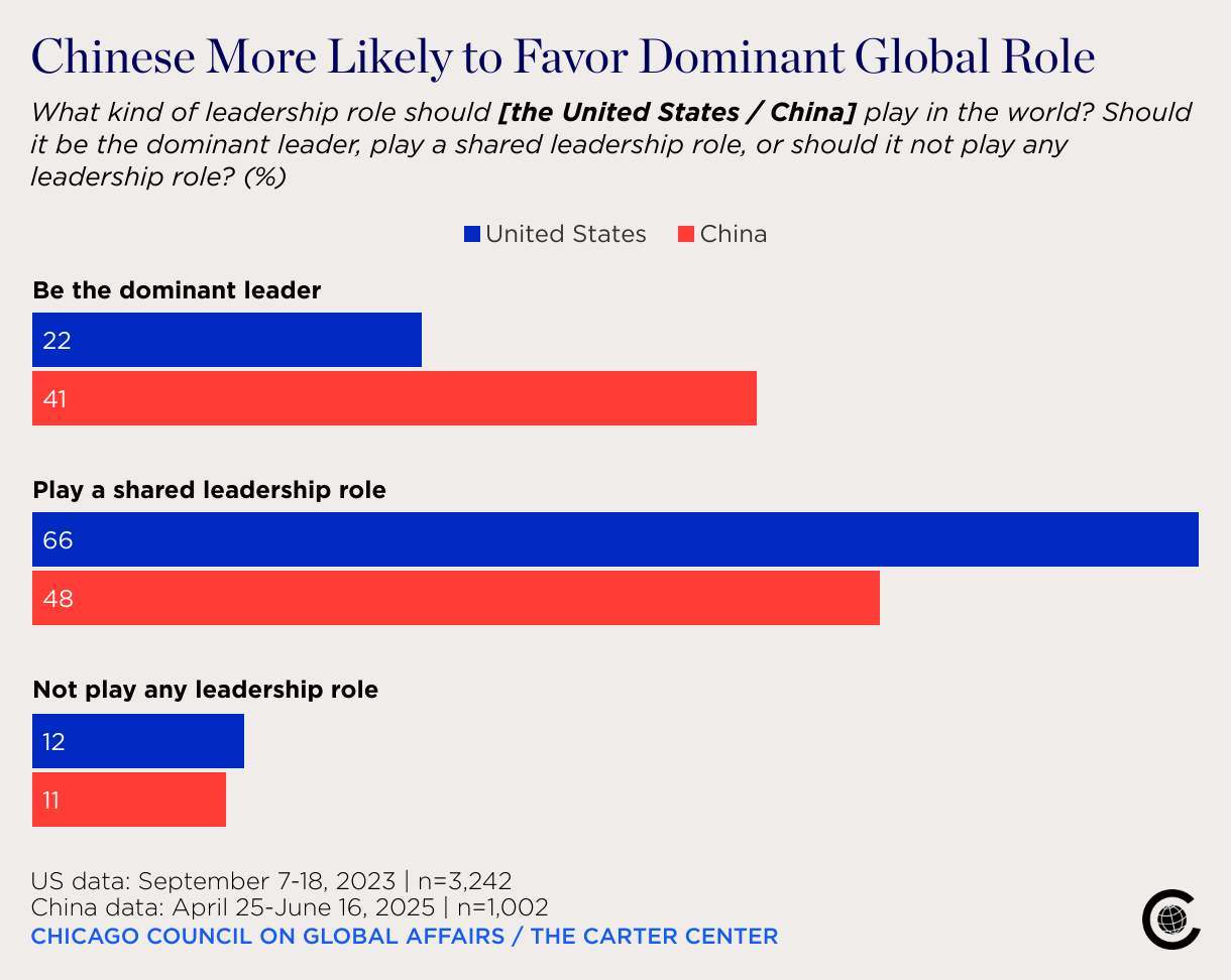 What kind of leadership role should [the United States / China] play in the world? Should it be the dominant leader, play a shared leadership role, or should it not play any leadership role? (%)