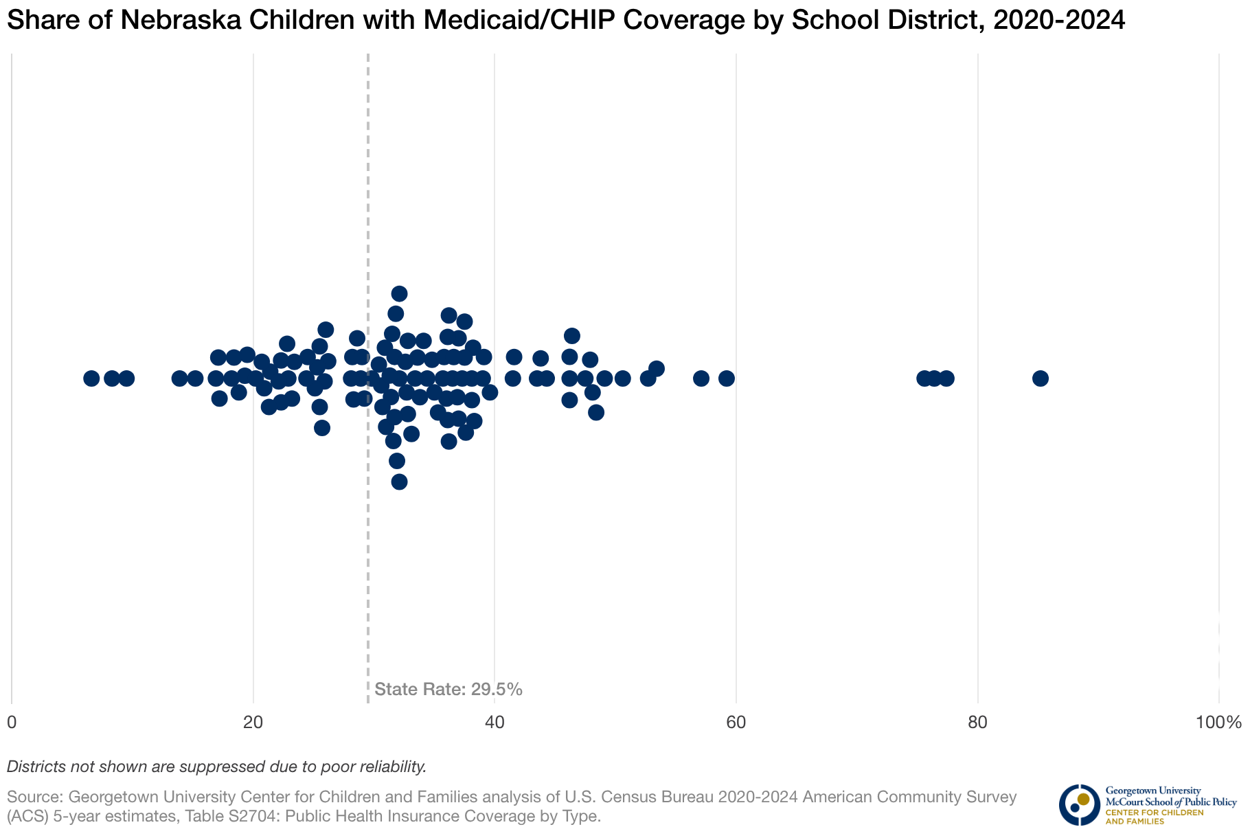 Share of Nebraska Children with Medicaid/CHIP Coverage by School District, 2020-2024