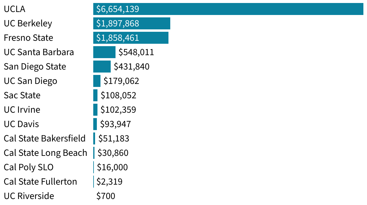 Bar chart showing 14 California public Division 1 universities, sorted by how much name, image and likeness compensation their athletes have received. UCLA has by far the most with $6.65 million.
